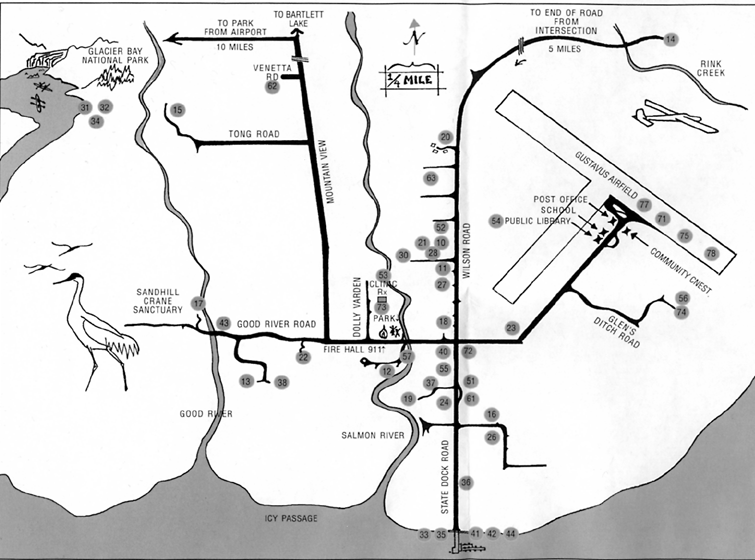 37-Sea Otter Kayak Glacier Bay 38-Spirit Walker Expeditions 40-Woodwind Adventures: Horse & Carriage 41-Wolf Track Expeditions 42-Wild Alaska Glacier Bay Adventures and Fishing 43-Homeshore Handwovens 44-Alaskan Feathers 51-Bear Track Mercantile 52-Fireweed Gallery 53-Gustavus Clinic 54-Gustavus Public Library 55-Wolf Track Creations 56-Glacier Bay Travel 57-Smokehouse Gallery 61-Gustavus Community Chapel 62-Gustavus Catholic Church 63-Orthodox Christian Church 71-Air Excursions 72-Auk Nu Tours 73-Bud's Rent-A-Car 74-TLC Taxi 75-Wings of Alaska Airlines 77-Fjord Flying Service 78-Alaska Airlines |